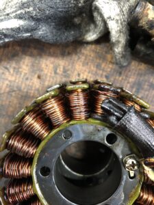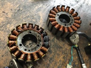 ジェネレータを外した写真です。ここまで来るのに外装やマフラー、スイングアーム?などを外さないといけないので案外手間です。
