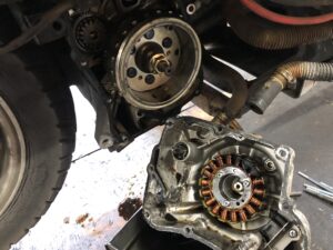 ジェネレータを外した写真です。ここまで来るのに外装やマフラー、スイングアーム?などを外さないといけないので案外手間です。