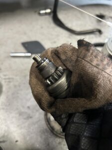 ひとまず駆動系を開けます。ピニオンギアは摩耗も少なく良好。注油して戻りを良くしておきました。